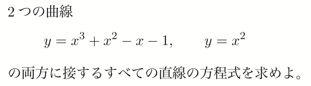 『2つの関数の両方に接するすべての直線の方程式を求めなさい』の一番シンプルな求め方は、3次関数の接点をtと置いて接線の式を作る。