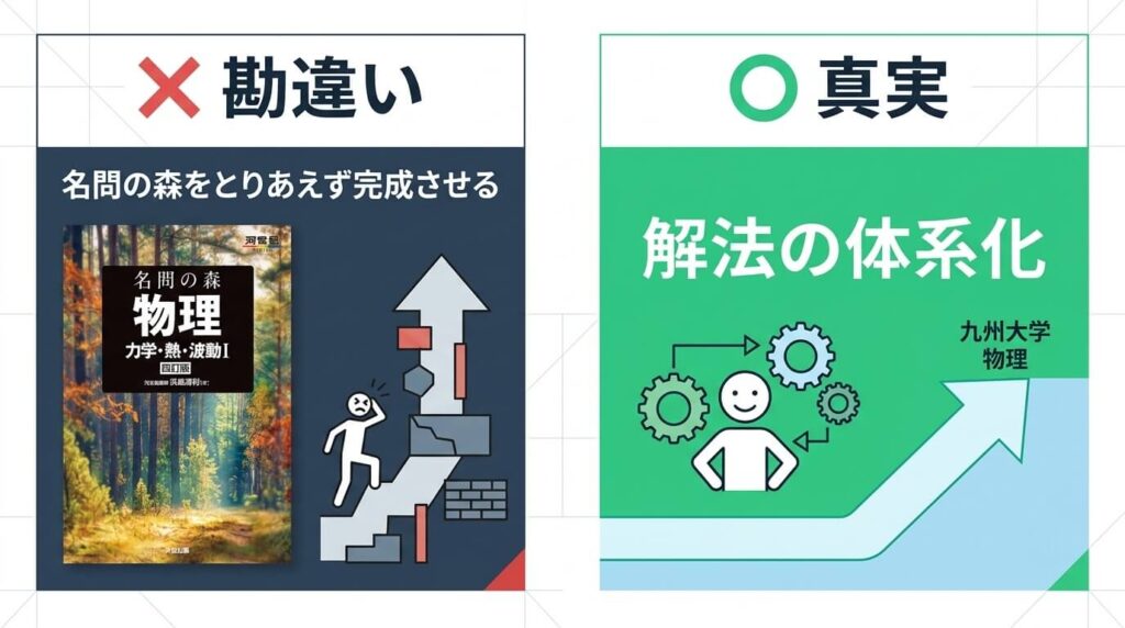 「名問の森を完成させたら九大物理は大丈夫」と勘違いしている人がいますが、ただ名問の森が解けるだけでは意味がありません。