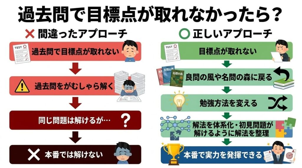 なので大事なのは、過去問で思ったように目標点が取れなかったら、過去問をがむしゃらに解くのではなくて、まずは名問の森の完成度を高めていく。