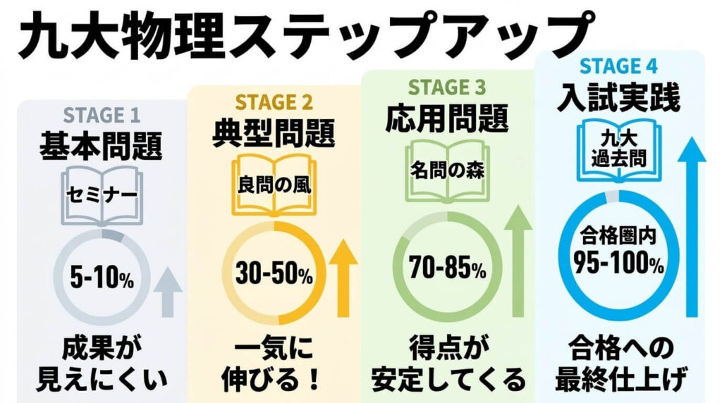 つまりこのステップ1を丁寧に積み上げていくことで、九大物理の点数アップには確実につながる。