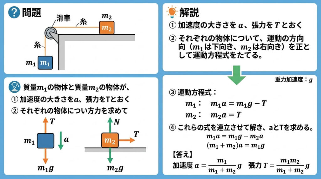 そして、2つの物体に対して運動方程式を立て、連立方程式を立てて加速度と張力を求める。