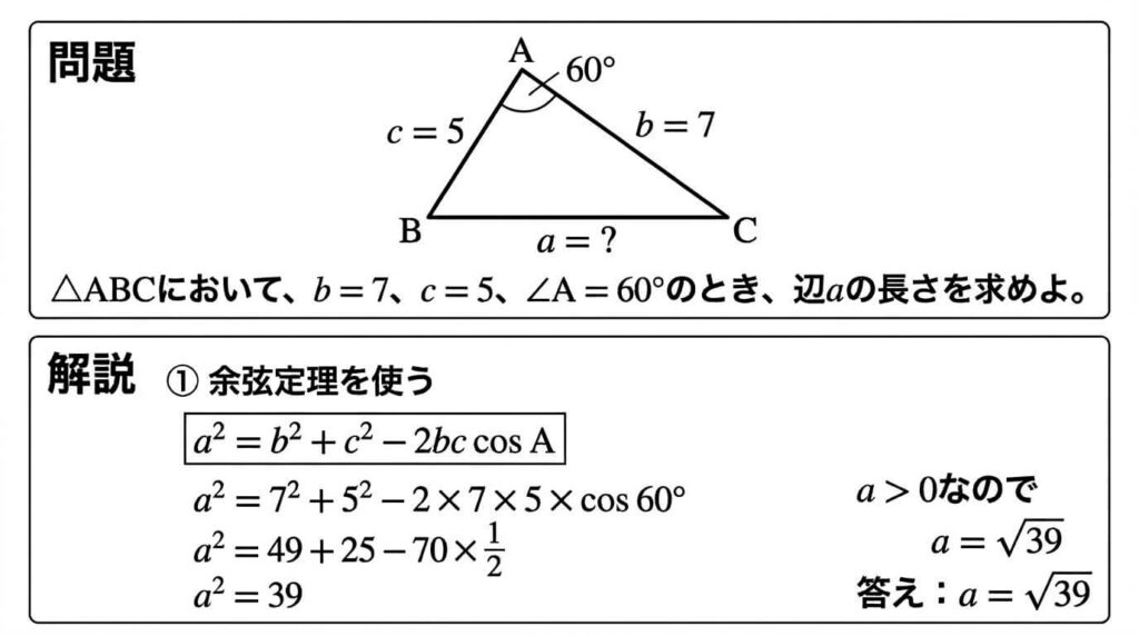 数学の難しい問題を解こうと思ったら、例えばこのような余弦定理をパッと使うだけで解けるような基本問題は、1秒で解法が思いついてスラスラ解ける必要があります。