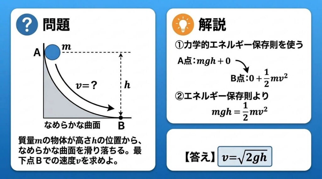 つまり「この状況だと力学的エネルギー保存則を使えばいいのか」程度の理解で終わると思います。