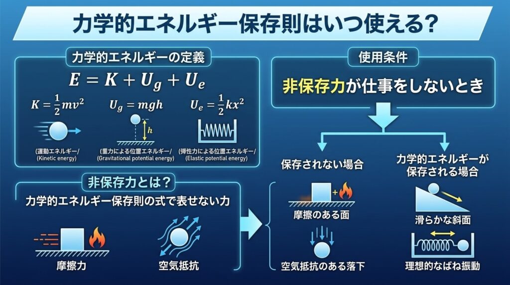 では、非保存力とは何か?非保存力とは、力学的エネルギー保存則の式で表せない力です。