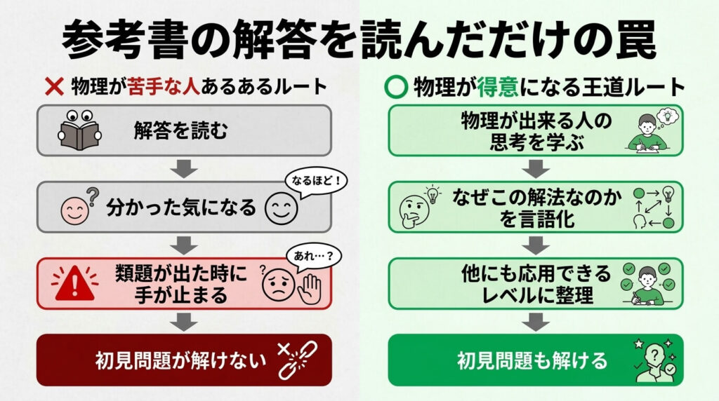 「参考書の解説を読むと分かった気になるけど、類題に取り組んだ時に手が止まる」という物理が苦手な人あるあるのルートをたどることになる。